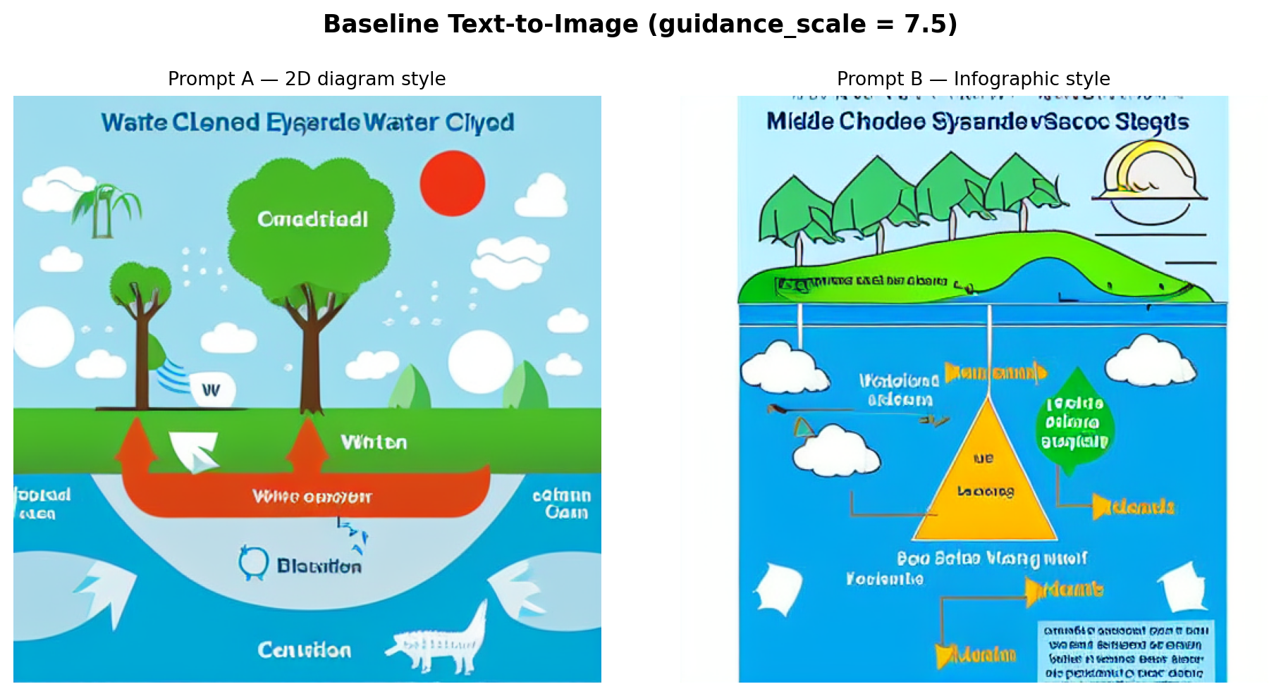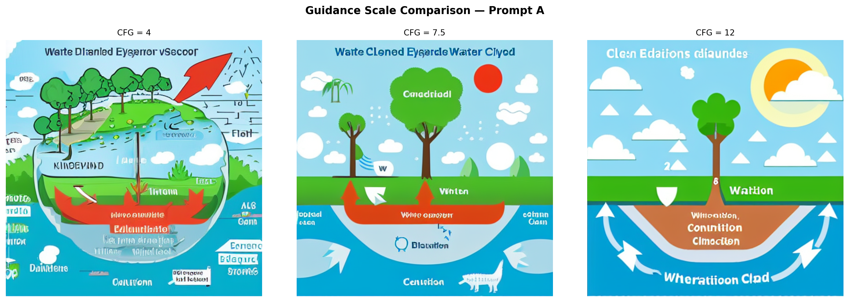 - Misleading elements: CFG = 4 is the most misleading. The “water cycle” visual may show water flowing in any direction or omit key stages entirely. Several outputs contain decorative arrows that carry no directional information about the cycle.