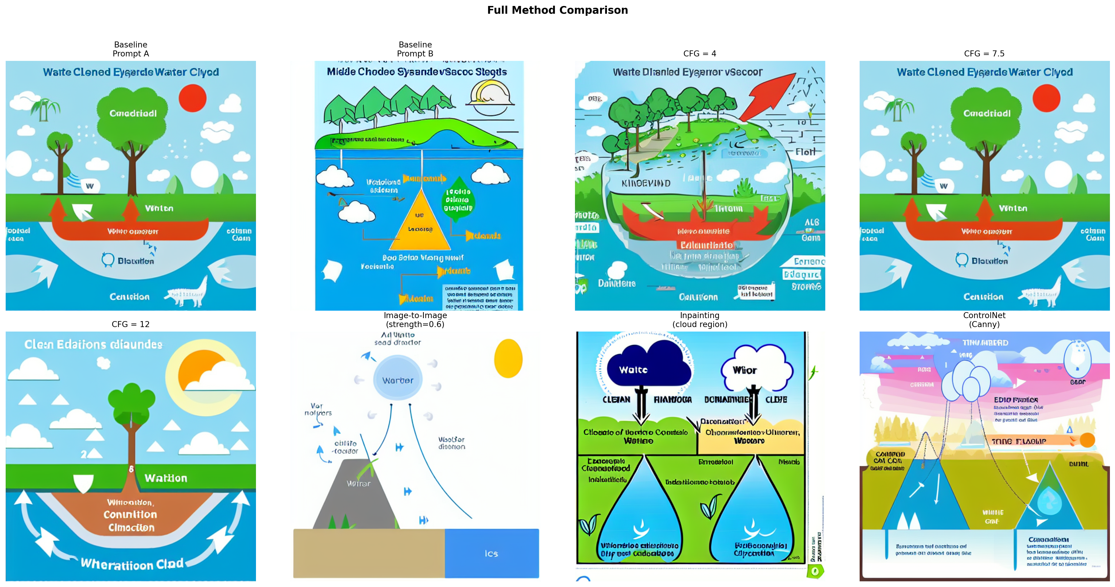 Based on this exploration, ControlNet with a hand-drawn reference diagram is the most appropriate method for generating classroom scientific diagrams. At a guidance scale of 7.5 and a ControlNet conditioning scale of 0.8, it consistently preserves the spatial layout, directional arrows, and component arrangement of the source sketch—the elements most critical for scientific correctness.