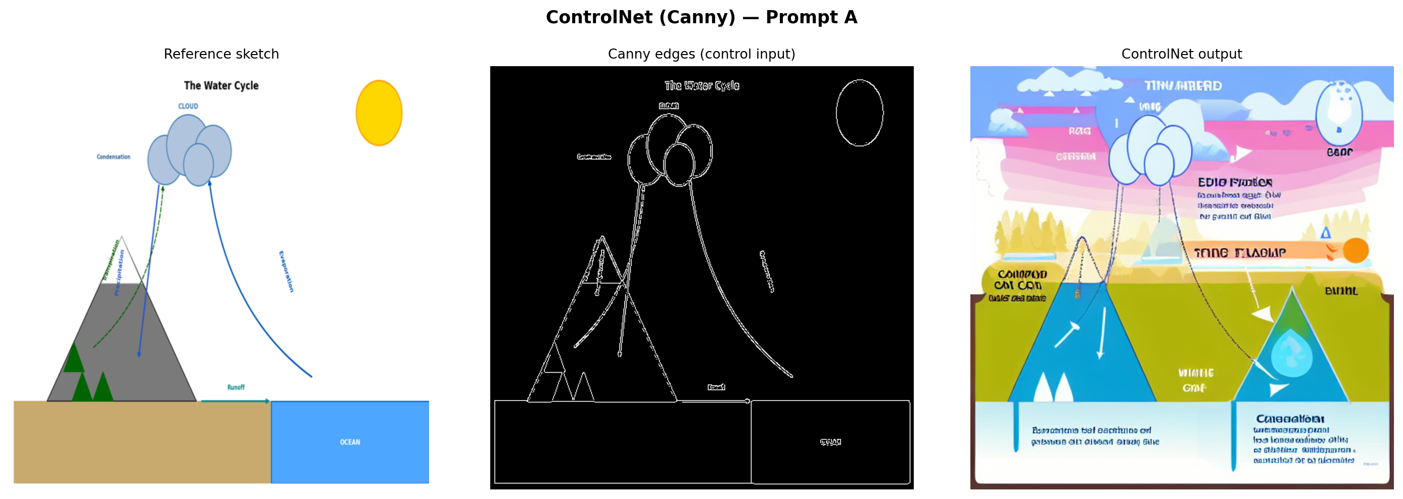 Analysis: ControlNet produces the most structurally faithful output of the three methods. The Canny edge map forces the model to respect the exact positions and shapes from the reference—the mountain silhouette, cloud cluster, ocean boundary, and arrow paths are all preserved. SD 1.5 then renders these structural outlines with realistic textures driven by the prompt. The key tradeoff is that the output inherits any inaccuracies in the reference sketch. If the reference has an arrow going the wrong direction, ControlNet reproduces that error with high fidelity.