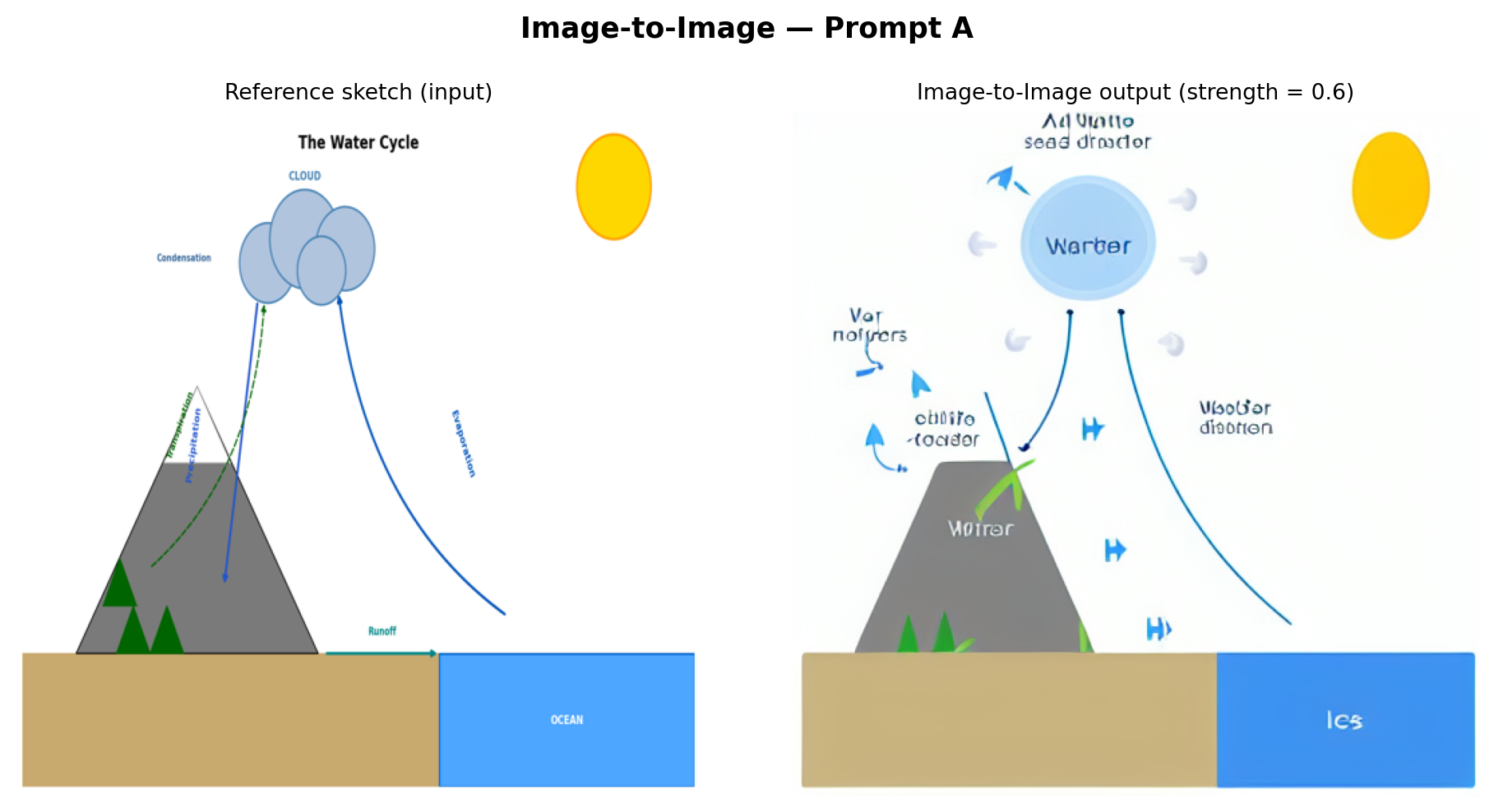 | Baseline — Prompt B | ~ Partial (atmospheric stages present, runoff absent) | ✓ Sky/ocean hierarchy correct | ✗ No directional cues | ~ Minor (naturalistic style obscures the cycle) |