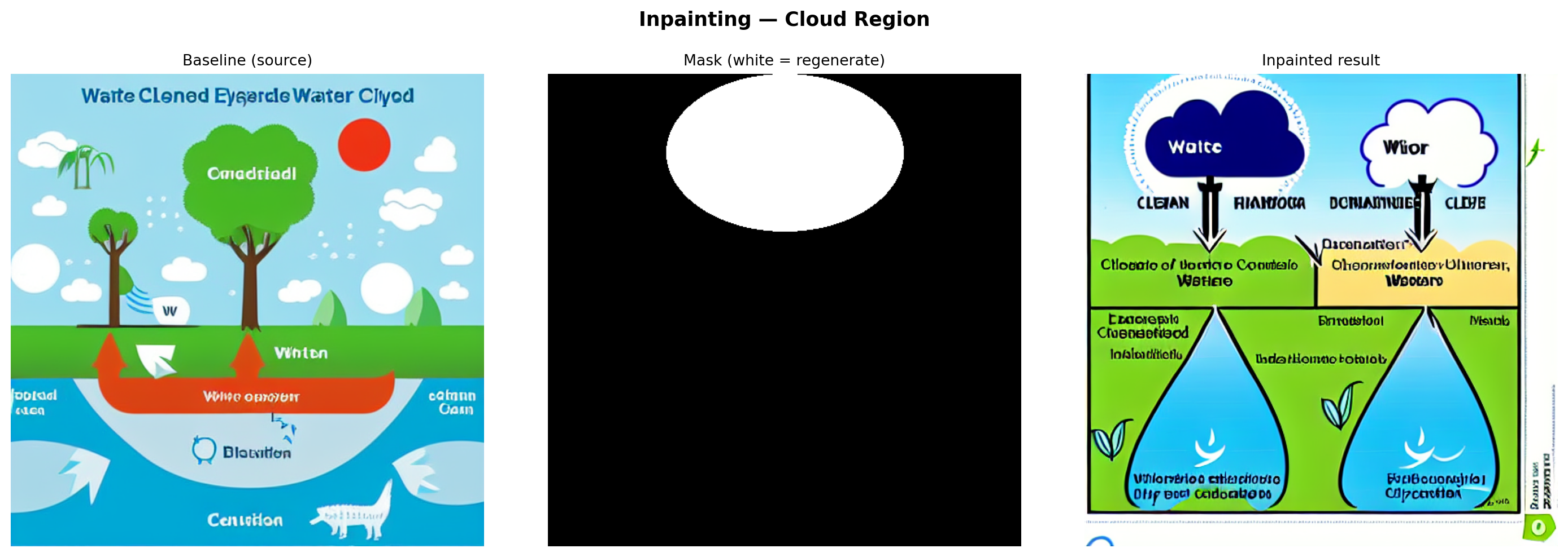 ["Baseline (source)", "Mask (white = regenerate)", "Inpainted result"],